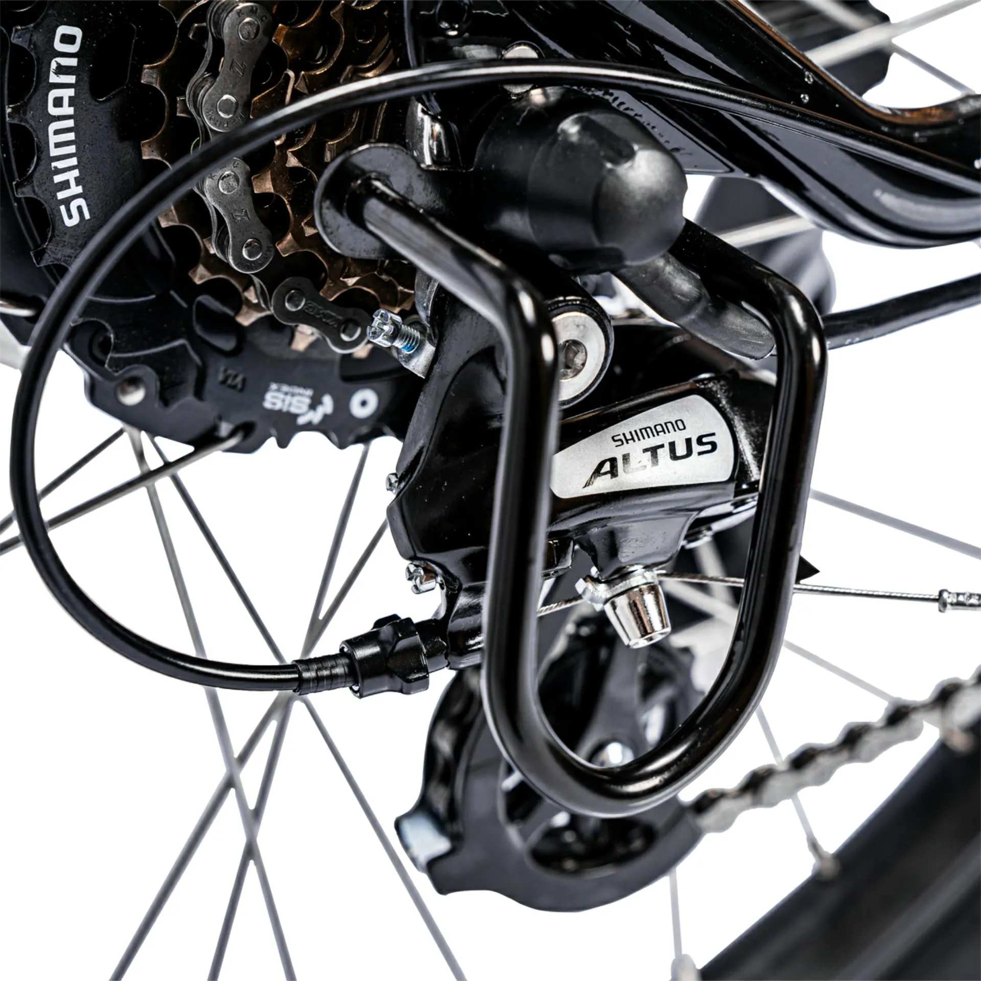 Gear shifts are smooth and effortless thanks to the Shimano Altus 7-speed rapid-fire gear shifter, and the power is transferred through an alloy 44-tooth chainset with 170mm alloy crank arms, coupled with a KMC 7-speed anti-rust chain.