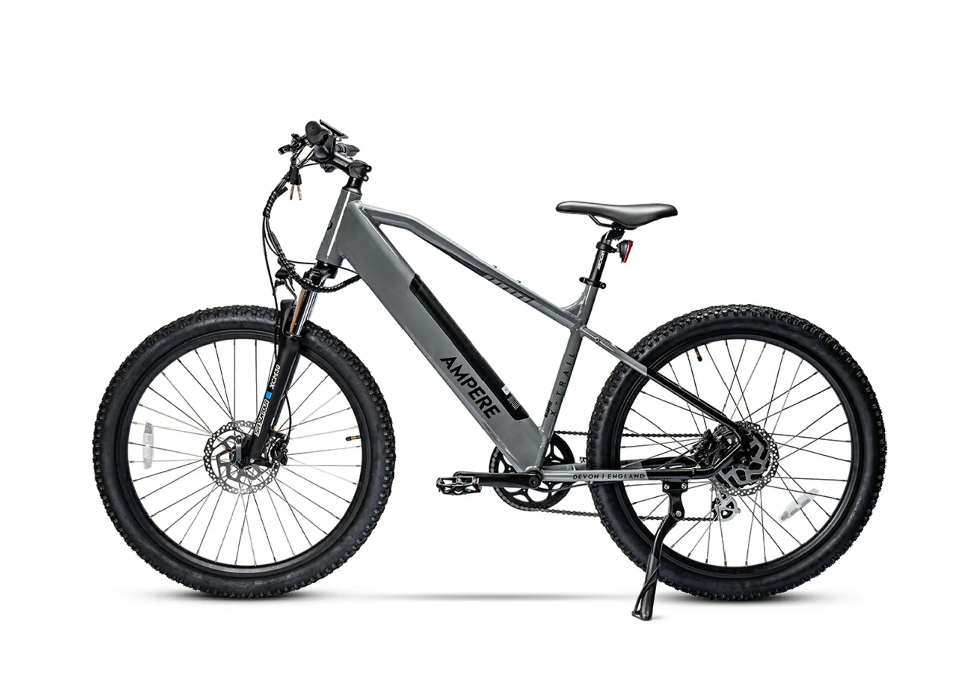 Completing this robust package are thoughtful accessories, including an alloy kickstand and an integrated front light for your convenience and safety. With an approximate weight of just 25 kg, this makes the Ampere X-Trail Mountain E-Bike your go-to choice for exploring the great outdoors with power, style, and comfort.