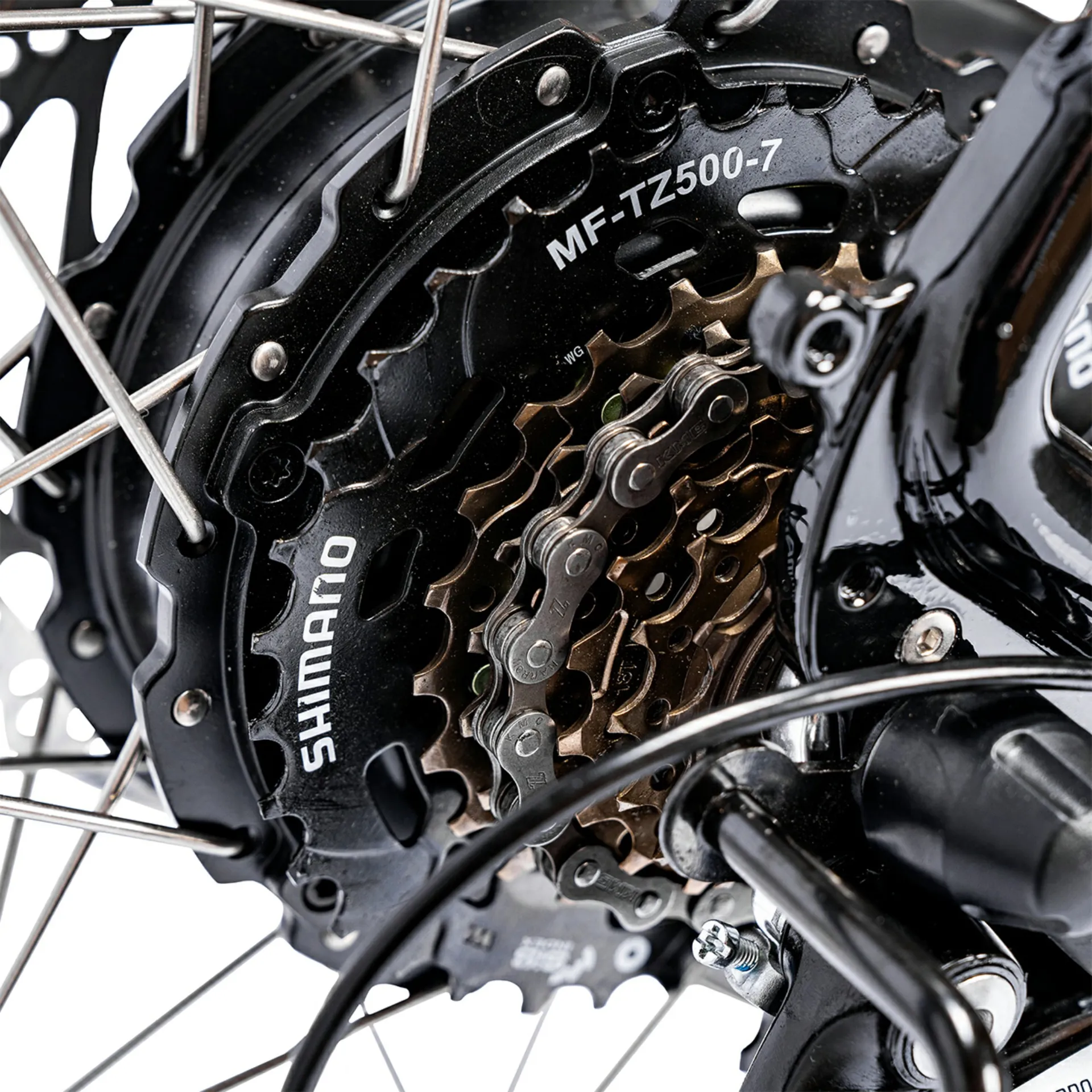 Gear shifts are smooth and effortless thanks to the Shimano Altus 7-speed rapid-fire gear shifter. Power is transferred through an alloy 44-tooth chainset with 170mm alloy crank arms and a KMC 7-speed anti-rust chain.