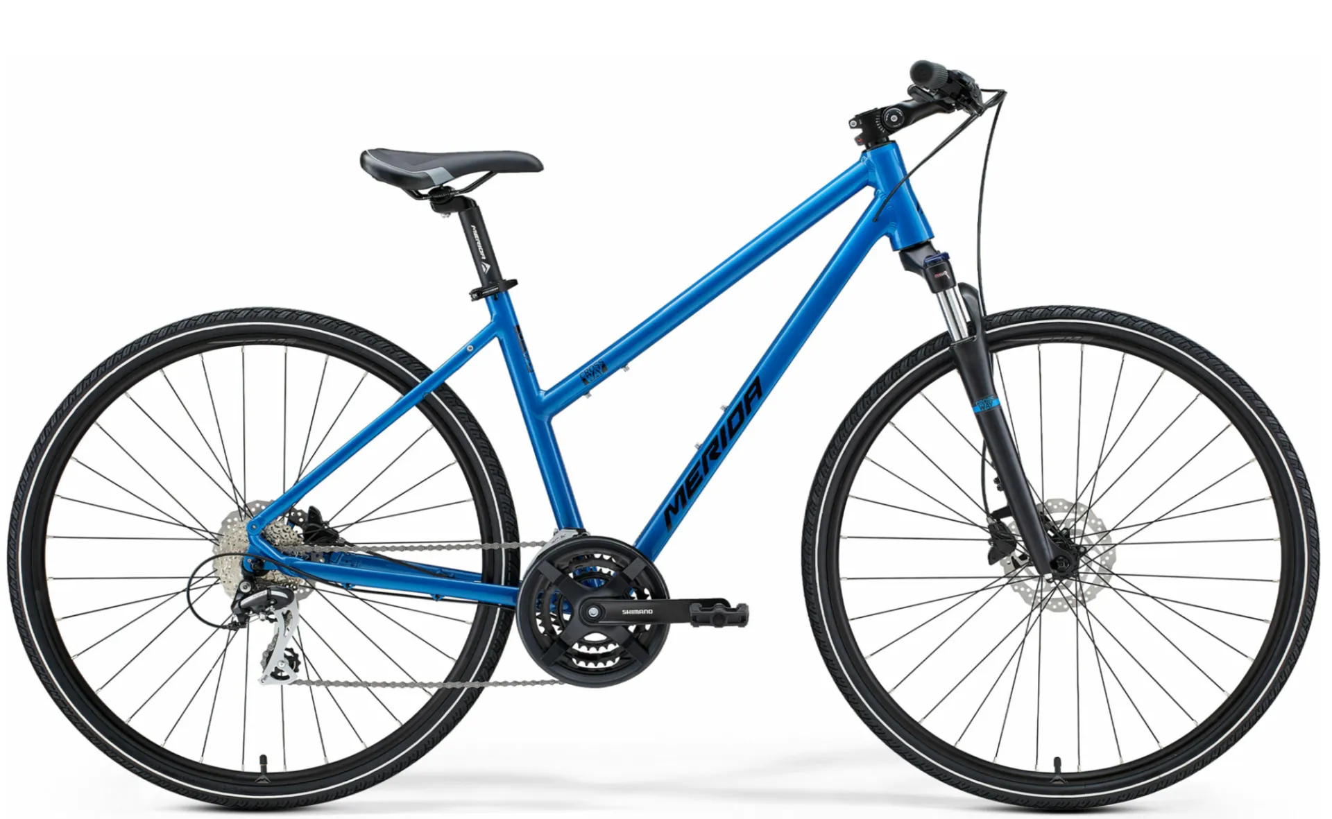 All Merida Crossway models are equipped with suspension forks to iron out any surface bumps. Adjustable ahead stems and suspension seat posts are also fitted on most SPEED models, providing extra comfort and an adjustable riding position. The sportier TFS models feature a regular seat post and stem to reduce weight.