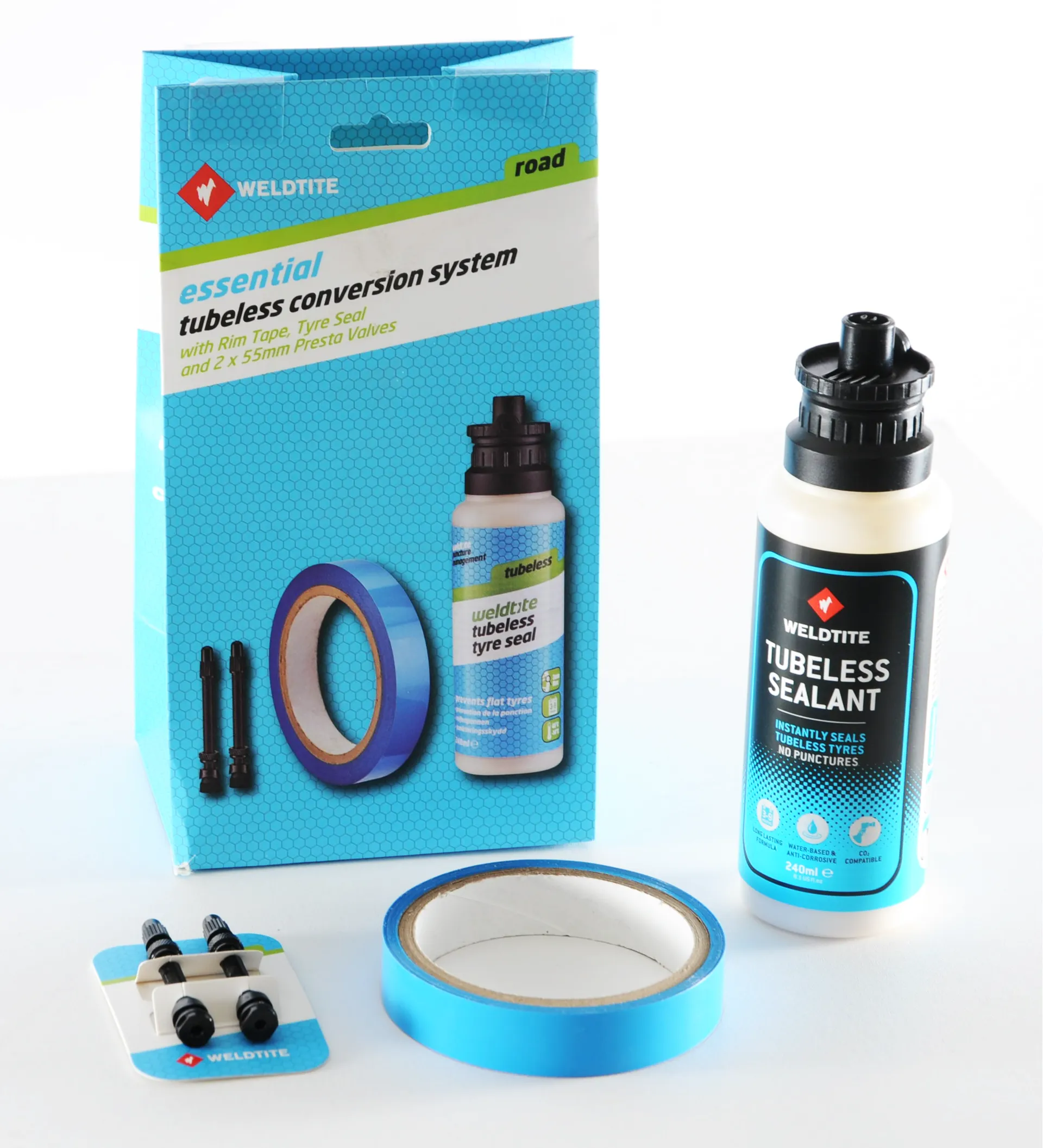 The Weldtite Tubeless conversion systems include all you need to install tubeless tyres other than a pump. Simply select your wheel size, fit the rim tape, insert the valve and inject the sealant.
