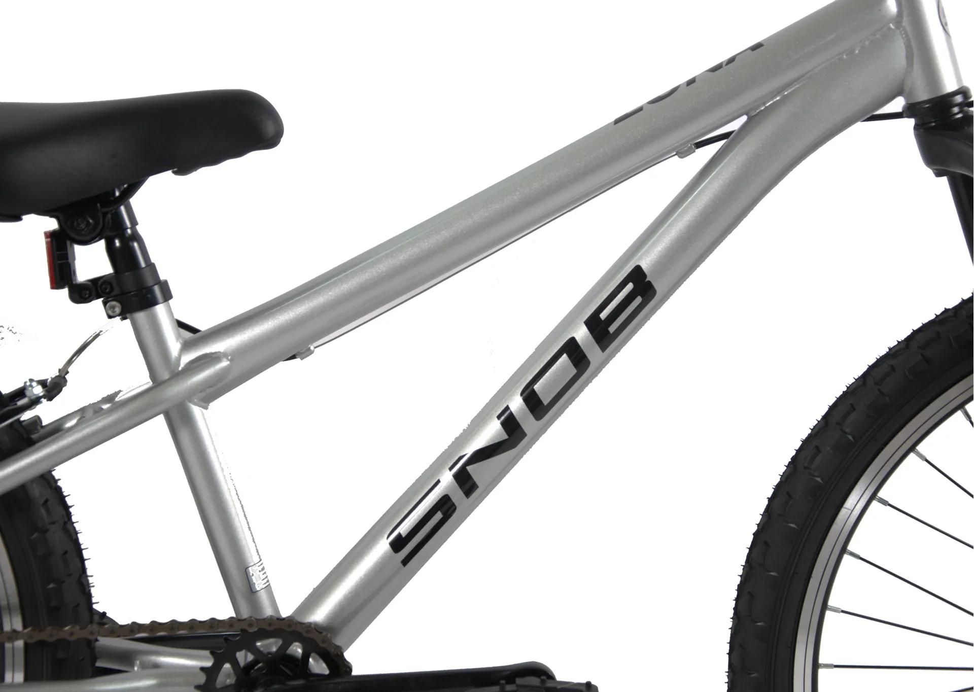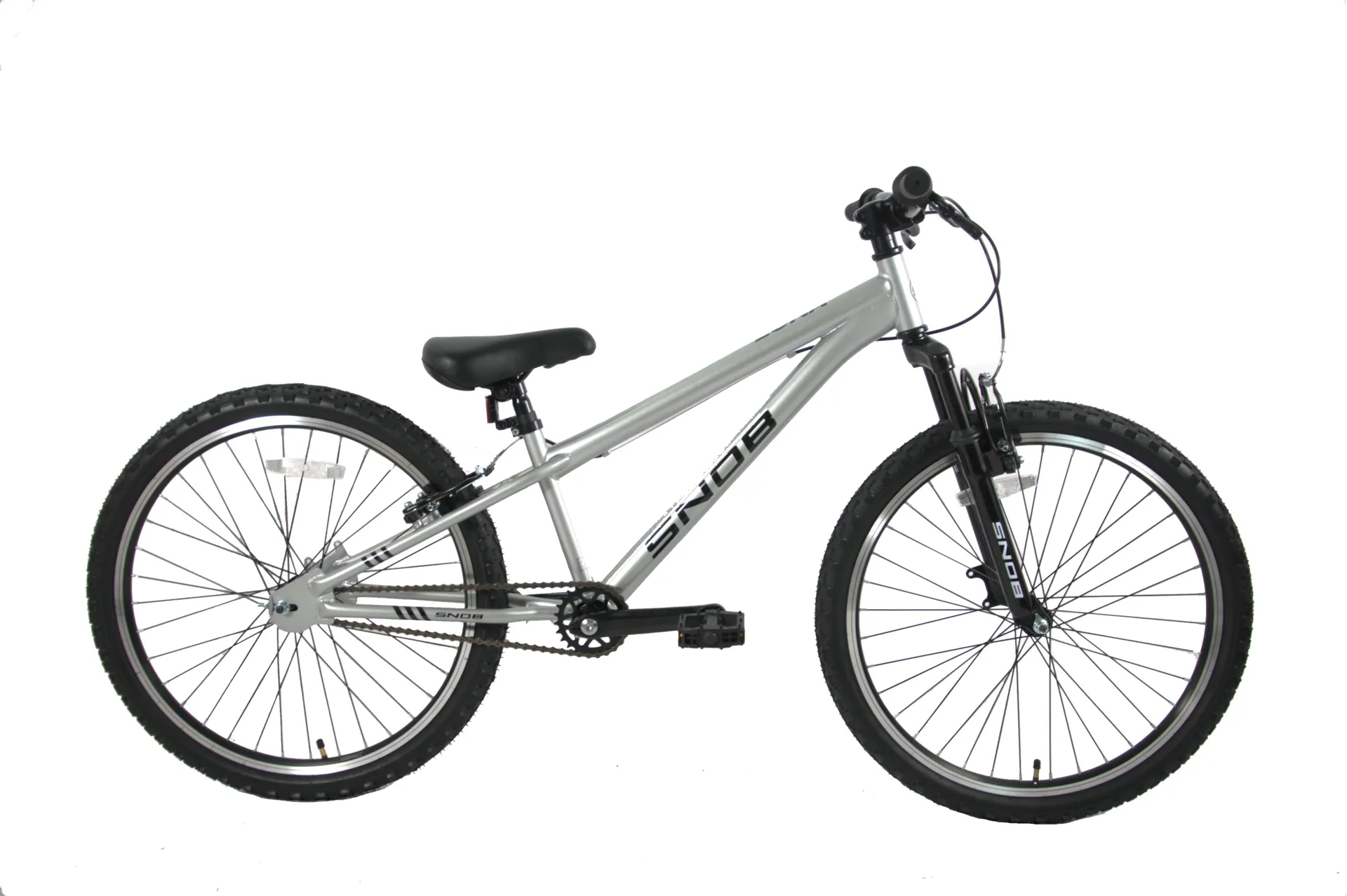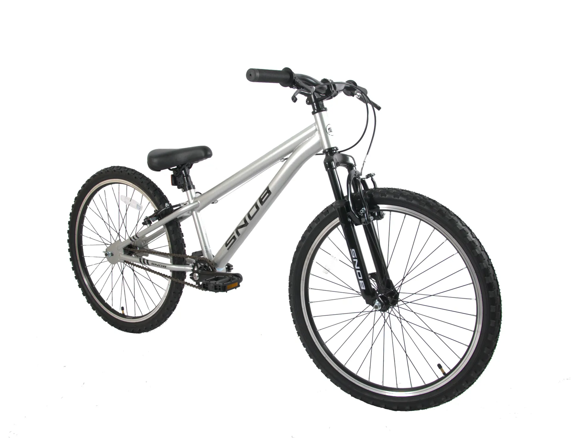 Get your young adventurer ready to ride with the Snob Luna 24" Single Speed Mountain Bike! This bike is designed with durability, comfort, and a stylish look in mind, making it a perfect choice for riders aged 8-12. With its standout Gloss Silver steel frame and sturdy Gloss Black front suspension fork, this bike isn’t just a ride—it’s an experience.