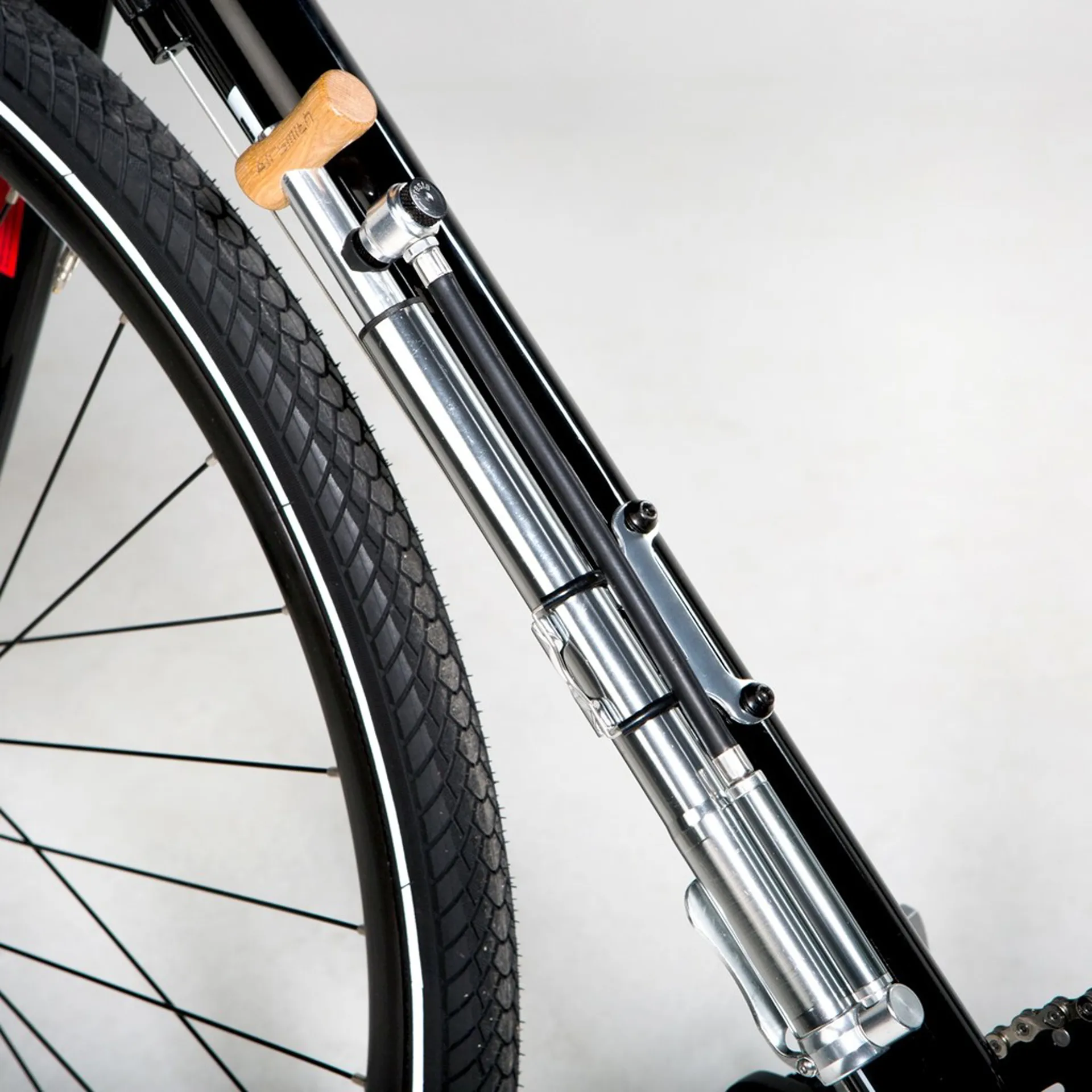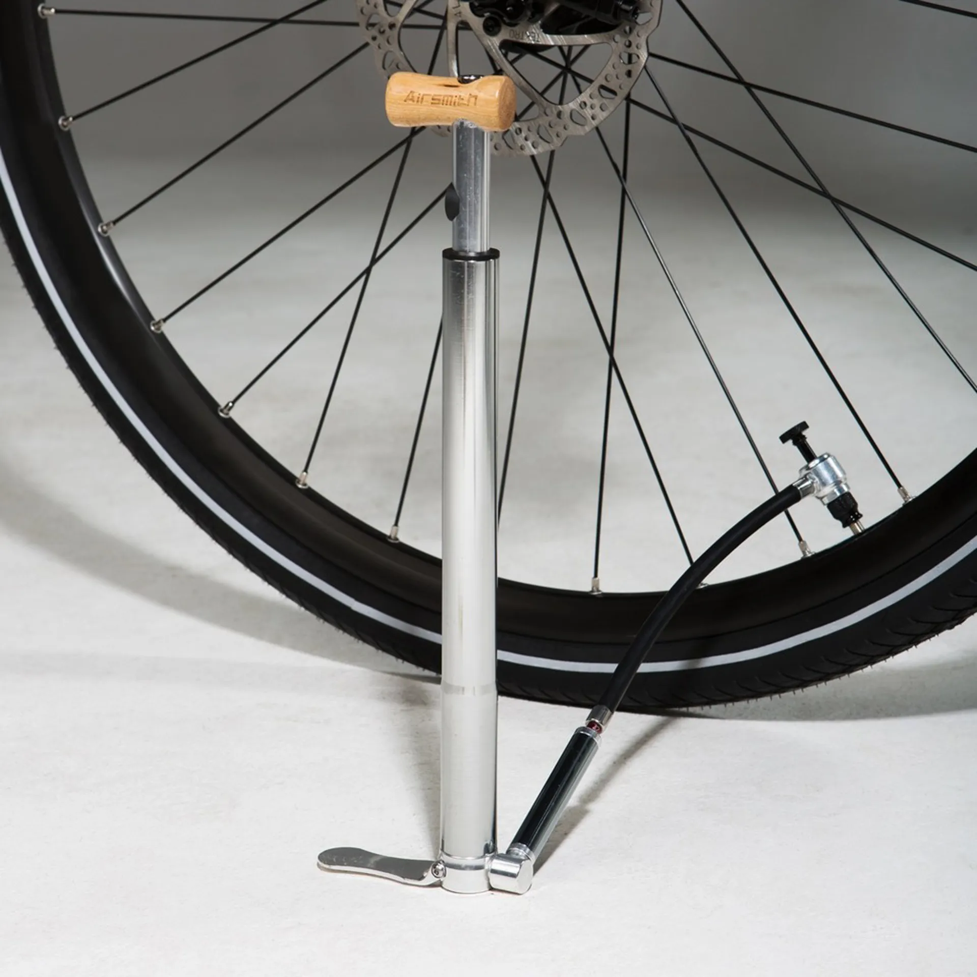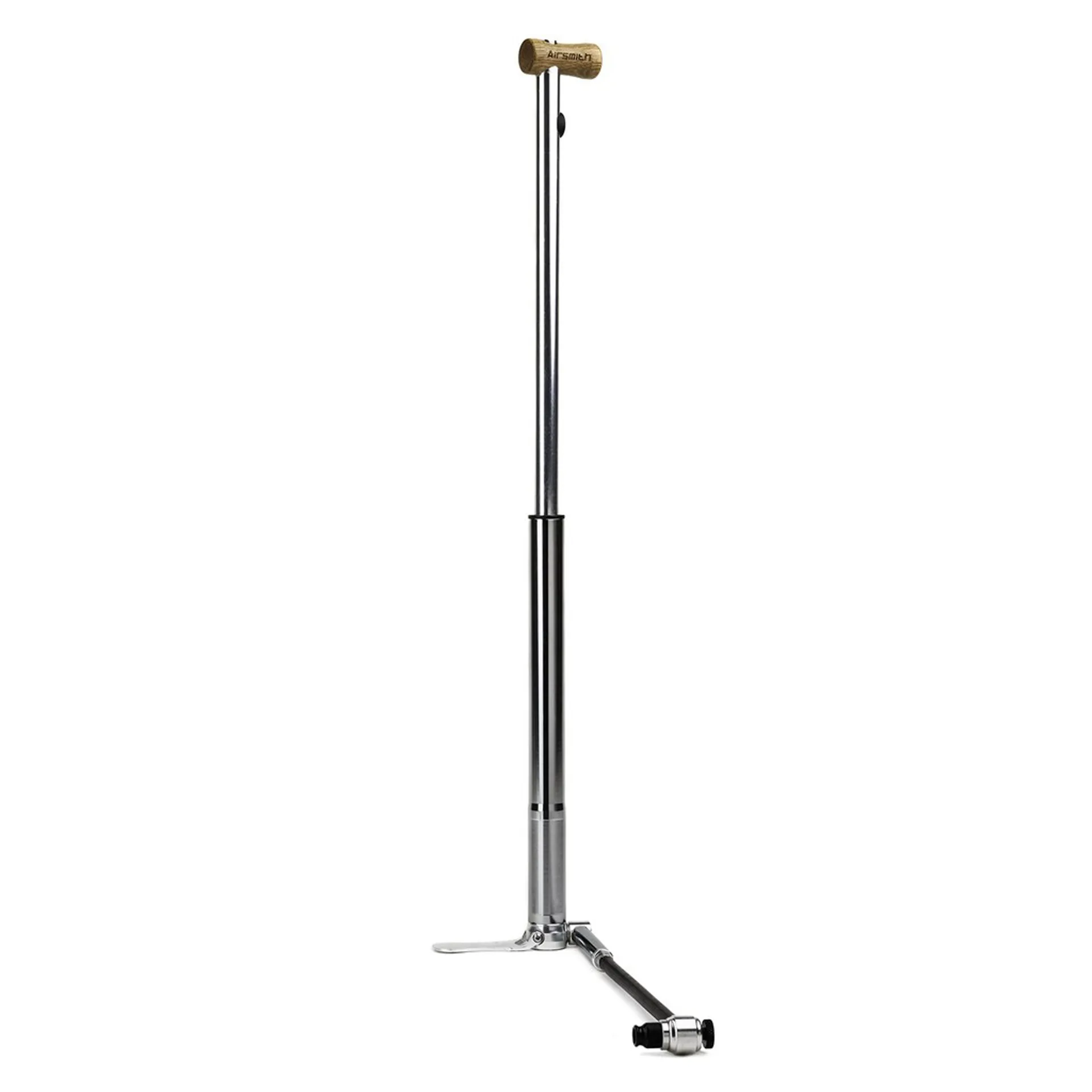 The crafted wooden handle and CNC'd x-bracket further add to the style. The dual valve head is mounted to a long hose that pivots at the base of the bicycle pump, making it very easy to position and mount on your inner tube's valve head. This model comes in 315mm length and is finished in a beautiful anodised gun metal grey.ThisAirsmith High Pressure Alloy Mini Floor Pump 140 PSIcontains the following features as listed below: